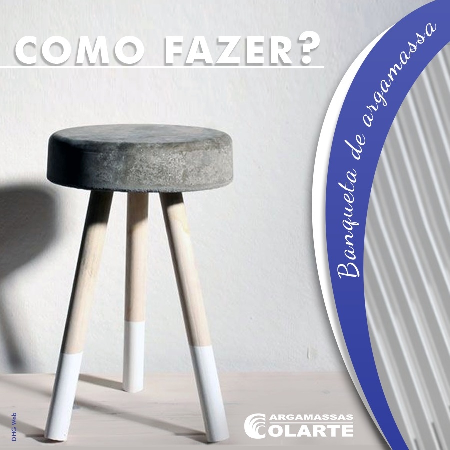Pegue a quantidade necessária de argamassa para o tamanho de sua banqueta, coloque no balde despejando água aos poucos, mexa bem até ficar no ponto de pasta. Pegue a bacia, e unte com bastante vaselina. Coloque a argamassa até a altura desejada. Segure a bacia e de algumas batidinhas contra o chão para tirar o ar. Pegue os cabos de madeira, e coloque os pés, aperte igualmente para que fique nivelado. Espere secar. Remova o banco com cuidado.